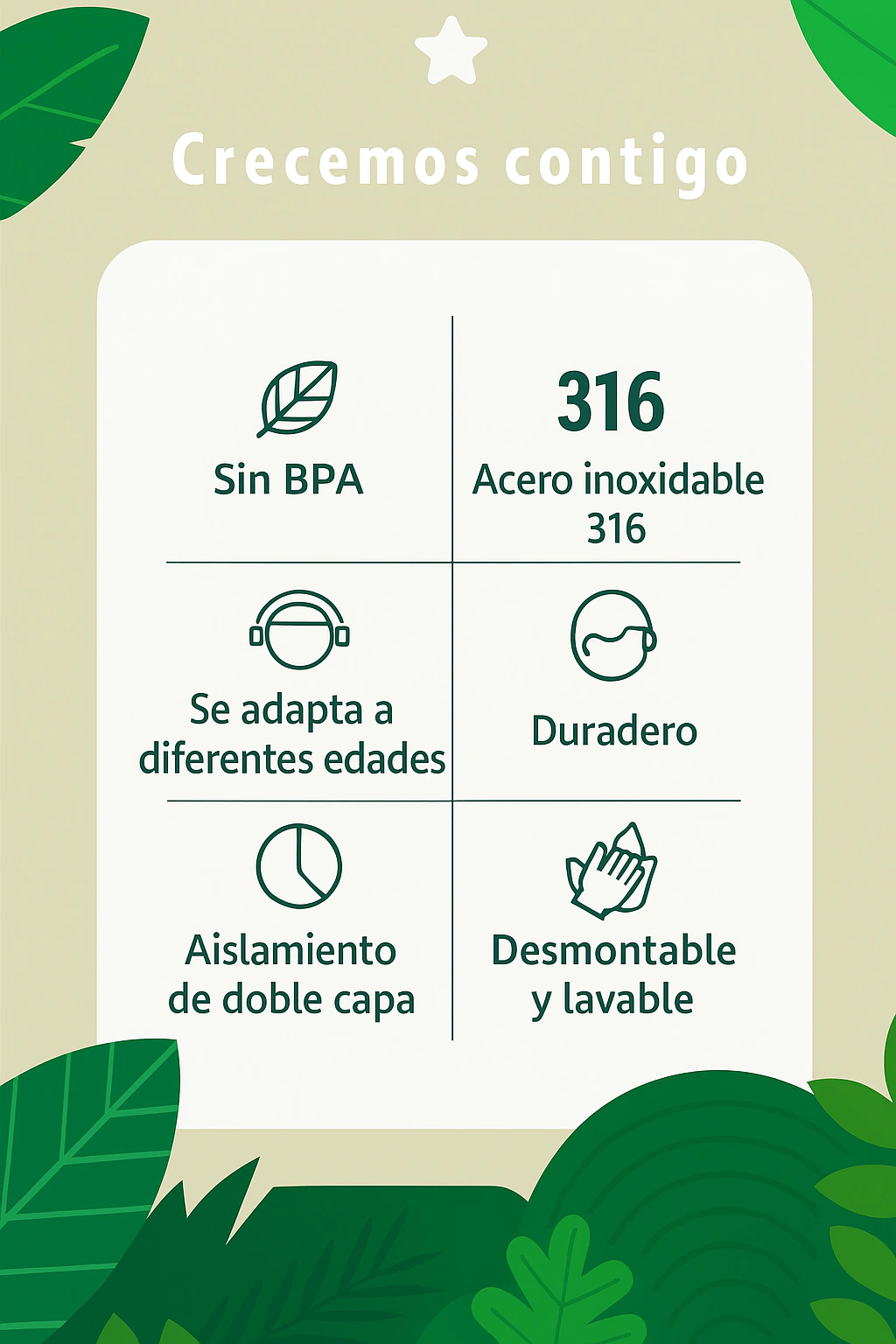 - Material resistente: Fabricado en acero inoxidable premium, que garantiza durabilidad y resistencia ante caídas y golpes, ideal para el uso diario de los niños.