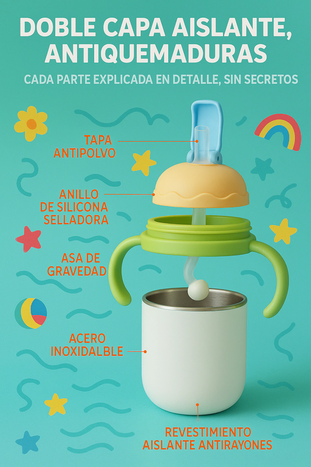 Diseño amigable: Incluye un pitillo y una agarradera, lo que lo convierte en la opción perfecta para que los bebés aprendan a beber de forma independiente, sin riesgo de derrames.